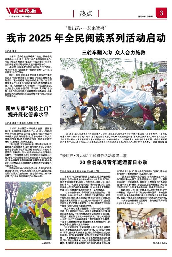 4月18日,众人合力将三轮车抬出路沟。当日12时左右,西华县田口乡李陈村东边的一处十字路口,一名村民骑着三轮车不慎从桥上栽入路沟,车上载有两个孩子。市文联三级调研员李哲、市民协主席杜忠义、西华县文联主席王鹏飞等人到田口乡开展民间文学田野调查工作,正好从此处经过,听到喊声后,他们急忙下车救援。最终在附近村民的帮助下,众人成功把大人和孩子救出,并将三轮车从沟底推上来,所幸大人、孩子皆平安无事。记者 梁照曾 摄