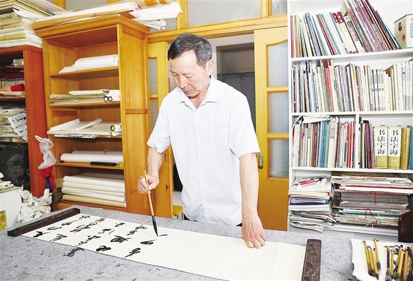 4月17日,记者走进崔传明的居家小院,映入眼帘的木板雕刻“萧竹堂”匾额张挂门楣。在二楼,一张宽大的书案用于创作,一边是整齐摆放的宣纸,书柜里装满了各类碑帖和书籍,四壁挂满了他的临创书作、高堂大轴、书卷精品。置身其中,如沐春风,张扬起伏的线条给人一种身临大自然的感觉,或春雨细如丝,或干裂秋风,或小桥流水潺潺……