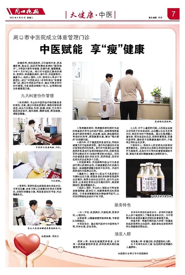 体重异常,特别是肥胖,不仅影响外形,更是糖尿病、高血压、脂肪肝等慢性疾病的“隐形推手”。为帮助大家科学减重、改善代谢、重塑健康,今年4月中旬以来,周口市中医院汇集治未病科、营养科、肾病糖尿病科、普外科、肝胆脾胃科、康复中心、临床心理科、儿科、制剂中心等多个专家团队,成立“中西医结合+多学科联合”体重管理门诊,通过中西医诊疗技术,融合开展多学科协作管理,为患者提供精准个性化、全周期的综合体重管理方案。