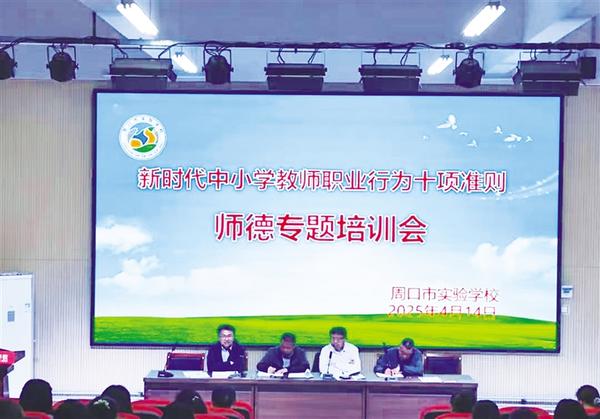 为深入学习贯彻《新时代中小学教师职业行为十项准则》,进一步强化师德师风建设,引导全体教师永葆为党育人、为国育才的赤子情怀。近日,周口市实验学校召开“扬清风树师德,践行育人使命”专题培训会。通讯员 牛映月 摄