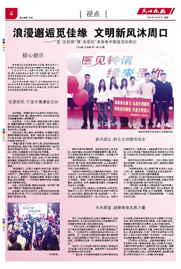 不负春光,向阳而生。这场浪漫的邂逅,不仅为单身青年点亮了爱情的希望,更以文明新风为底色,为新时代青年发展注入温暖而有力的正能量。随着此类活动的常态化开展,相信会有更多青年在周口这片充满机遇的土地上,收获美满爱情、成就事业理想,共同书写城市与个人发展的美好篇章。