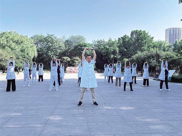 本报讯 “双手托天理三焦,左右开弓似射雕……”4月30日8时许,周口人民公园内乐声悠扬,30余名身着白大褂的周口市中医院医护人员正练习八段锦,行云流水的动作引得晨练市民纷纷驻足,不少人还跟着模仿起来。