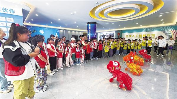 “握手拜年”“翻滚比心”“跳跃跑动”……机器狗随着指令表演各种动作,引得小记者欢呼连连。在“AI奇妙游”环节,小记者近距离观察能作诗绘画的DeepSeek人工智能模型,惊叹其将文字瞬间转化为图画的能力。