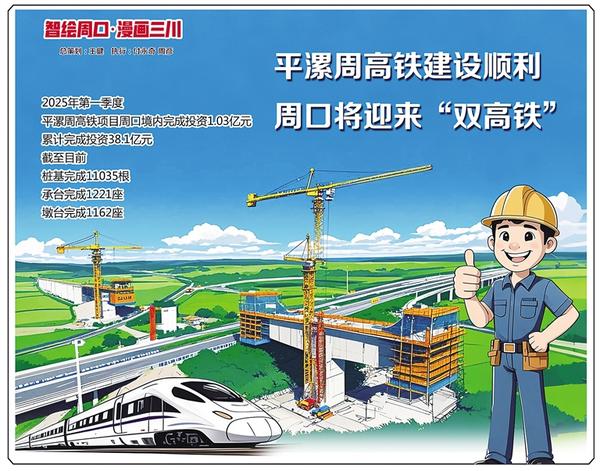 初夏时节,平漯周高铁项目周口段一施工现场机械轰鸣,工程车辆来回穿梭,来自中铁七局的建设者挥汗如雨,紧张开展连续梁施工作业。今年第一季度,平漯周高铁项目周口境内完成投资1.03亿元,累计完成投资38.1亿元。该项目建成后,我市将拥有“双高铁”,跻身高铁枢纽城市行列,极大提升交通区位优势,为经济发展注入新动力。记者 付永奇 周彦 文/图