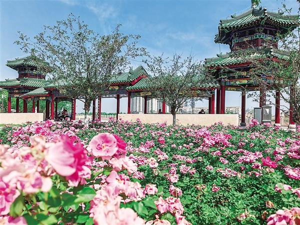 中心城区八一大道与滨河南路交叉口西侧游园内月季花盛开。近日,在中心城区多条提升改造的道路中间及两侧的绿化带内,“棒棒糖”月季花和地栽刺玫花如约盛开。繁花红的似火、粉的如霞,高低起伏、错落有致地分布,与城市建筑、道路景观相互映衬,无论你是漫步在街头游园小径,还是驱车行驶在主次干道,都能邂逅繁花,满眼皆是风景。记者 李瑞才 摄