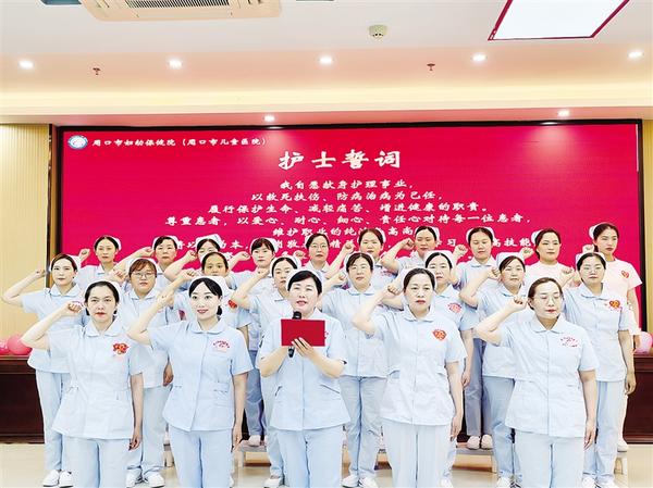 周口市妇幼保健院护士代表重温护士誓词。5月12日是第114个国际护士节,连日来,我市各医疗机构的护理工作者以文艺汇演、技能竞赛等形式,重温南丁格尔精神,共同庆祝第114个国际护士节。记者 郑伟元 摄
