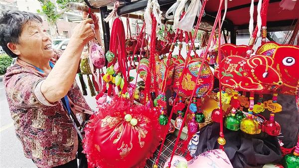端午临近,街头巷尾飘起阵阵药草清香。记者偶遇一位银发奶奶正在街头售卖手工缝制的香包。放眼望去,小车上的香包琳琅满目,造型丰富多样。五彩丝线穿梭缠绕,搭配着红、绿、青、蓝、紫等各色线穗,轻轻晃动,灵动飘逸,每个细节都彰显着传统手工艺的精巧。 记者 刘俊涛 摄