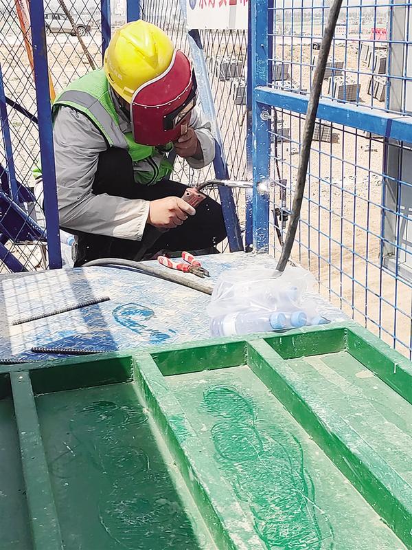 当日11时,烈日当空,记者站在引道的钢筋操作面上,钢筋的灼热从鞋底传上来,小腿能感受到肆意升腾的热气。不远处是吊机林立和人影晃动的码头施工现场。洒水车经过后的地面,热浪夹杂着水蒸气将远处堆场正在施工的打桩机与挖掘机等器械扭曲成晃动的虚影,连偶尔刮过的风都裹挟着灼人的铁锈味。