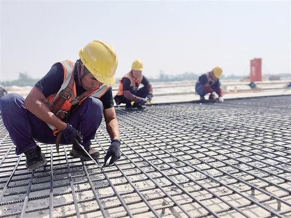在码头的1号泊位、2号泊位、3号泊位,8个工作班组在码头平台上绑扎钢筋、焊接上下通道、平整混凝土操作面……汗渍浸透工装,安全帽下的头发湿漉漉地贴着额头,汗珠顺着眉骨滚落,落在炙热的钢筋上。
