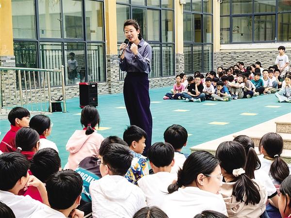 5月9日,在中心城区开元路小学,法治进校园活动及心理健康教育普及活动正在开展,孩子们围坐在操场上,认真聆听律师王萌萌的宣讲。