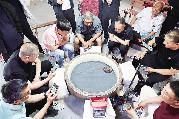 首场对决在退休职工老赵与县城商人大林之间展开。赛前,两只鹌鹑均需称重——均为二两左右,属同一重量级,确保比赛公平。老赵的鹌鹑羽色偏黑,且叫它“小黑”;大林的鹌鹑羽色稍浅,就叫作“小灰”吧。老赵先将“小黑”放入直径0.9米的笸篮,撒几粒谷子任其啄食,随后大林放入“小灰”。为争夺谷粒,两鹌鹑即刻缠斗。许富伟在直播间科普:“参赛鹌鹑需提前禁食一日,以饥饿感激发护食凶性。但如今的‘职业选手’无论有无食物,见面即战,直至一方败走。”