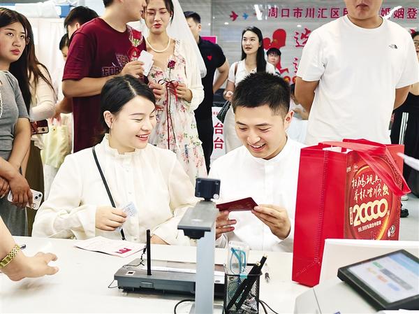 5月20日一早,在川汇区民政局婚姻登记处,前来登记的新人络绎不绝。填表、审核、盖章……在工作人员的引导下,一对对新人顺利领证,大家的脸上洋溢着甜蜜和幸福的笑容。