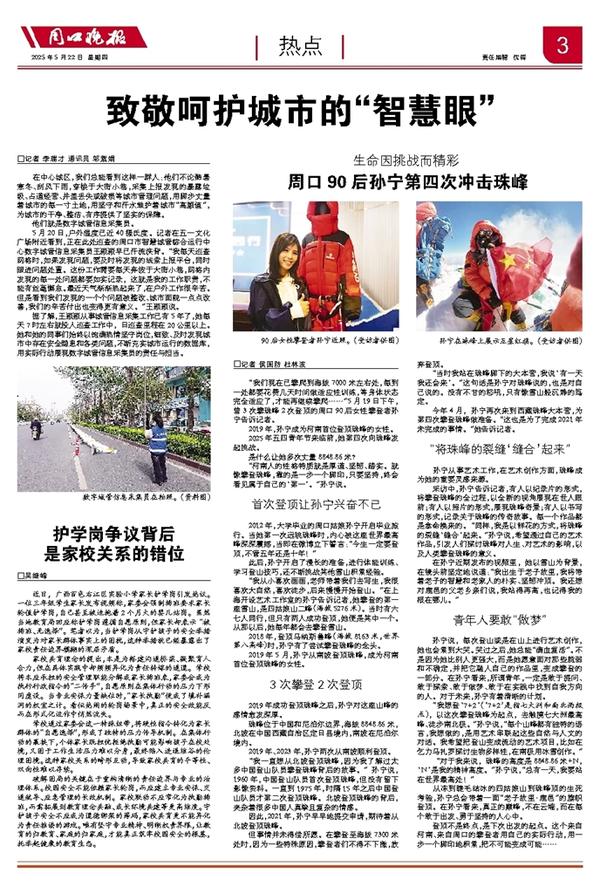 “我们现在已攀爬到海拔7000米左右处,每到一处都要花费几天时间做适应性训练,等身体状态完全适应了,才能再继续攀爬……”5月19日下午,曾3次攀珠峰2次登顶的周口90后女性攀登者孙宁告诉记者。
