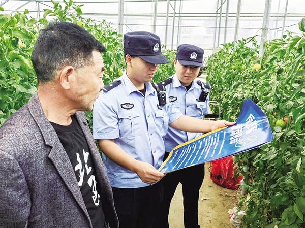 民警走进蔬菜大棚,向菜农宣讲防范电信诈骗知识。连日来,扶沟县公安局以 “提升服务水平、优化打防机制、增强处置能力、提高菜农和企业满意度”为目标,创新推出“田间警务” 新模式。该局民警通过走访菜农、开展反诈宣传、维护市场秩序等便民服务,结合打击违法犯罪、化解矛盾纠纷、实施无缝隙巡逻防控等治安举措,全方位为菜农和企业增产增收保驾护航。通讯员 刘丽娜 摄
