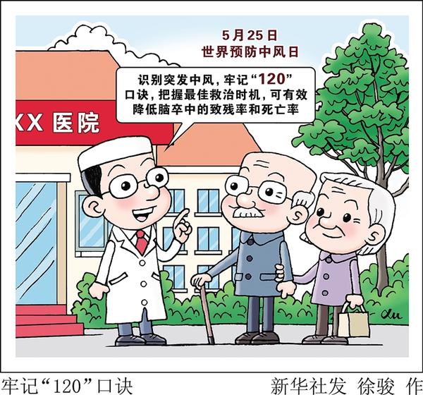 中风又称“脑卒中”,具有高发病率、高致残率、高死亡率、高复发率、高经济负担等特点,是影响群众健康的重大疾病。5月25日是世界预防中风日,专家表示,识别突发中风,牢记“120”口诀,把握最佳救治时机,可有效降低脑卒中的致残率和死亡率。 新华社发 徐骏 作