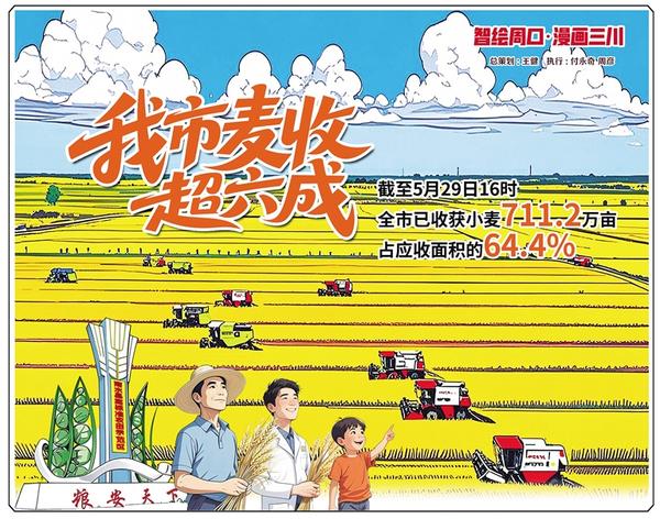 记者从市农业农村局获悉,截至5月29日16时,全市已收获小麦711.2万亩,占应收面积的64.4%。其中,川汇区(含示范区)94.4%;沈丘县90.2%;郸城县87.7%;商水县85%;项城市 78.5%;淮阳区65.6%;西华县64.9%;鹿邑县53.4%;扶沟县35.9%;黄泛区农场33.1%;太康县26%。记者 付永奇 周彦 文/图