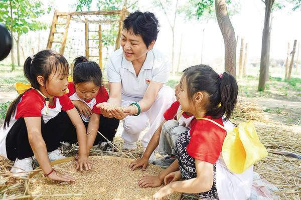 5 月 28 日,周口市实验幼儿园老师为孩子们讲解小麦的生长过程。当日,该园开展“小满芒种”主题食育课活动,孩子们在老师的带领下走进麦田,诵节气谚语、触麦芒、数麦粒,体验一粒麦子的“生命之旅”,引导孩子们从小养成爱惜粮食的好习惯。记者 付永奇 通讯员 张黎 摄