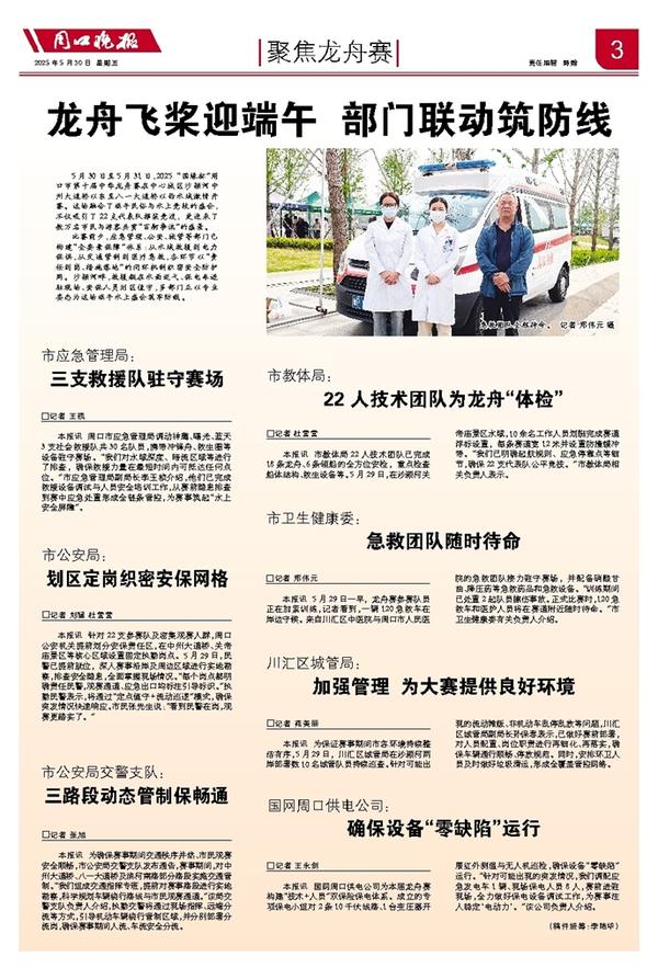 比赛前夕,应急管理、公安、城管等部门已构建“全要素保障”体系:从水域救援到电力保供,从交通管制到医疗急救,各环节以“责任到岗、措施落地”的闭环机制织密安全防护网。沙颍河畔,救援艇在水面巡弋、保电车进驻现场、安保人员划区值守,多部门正以专业姿态为这场端午水上盛会筑牢防线。