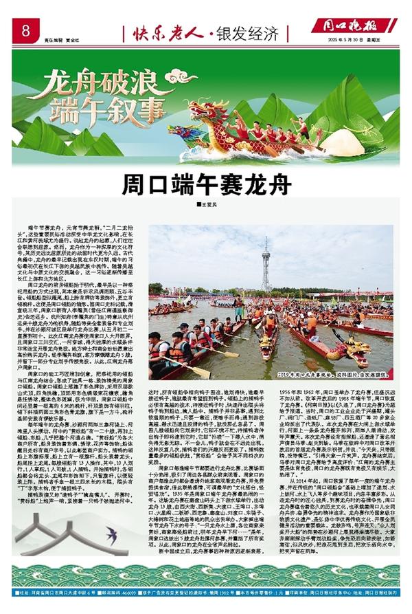 从2014年起,周口恢复了每年一度的端午龙舟赛,并在传统的“周口翎船会”基础上增加了速划、水上拔河、水上飞人等多个趣味项目,内容丰富多彩。从造龙舟时的匠心独具,到赛龙舟时的奋楫争先,周口龙舟赛蕴含着悠久的历史文化,也承载着周口儿女同舟共济、奋勇争先的精神追求。龙舟赛作为国家级非物质文化遗产,是弘扬中华优秀传统文化、开展全民健身活动的重要载体。龙鼓齐鸣,号声连天,“众人划桨开大船”的阵势在沙颍河上展现得淋漓尽致。大家齐刷刷挥动手臂划动船桨,争先恐后向前疾驶,如箭离弦,似风吹沙,把浪花甩到身后,把欢乐洒向水中,把笑声留在两岸。
