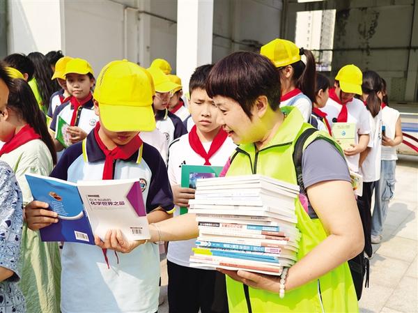 5月29日,周口萤火虫公益志愿者把图书发到学生手中。当日,周口萤火虫公益志愿者和周口华富酒业有限公司的爱心人士走进市城乡一体化示范区扶沟路小学,向该校学生捐赠了价值3万余元的图书。当日一早,载着1000多本图书的面包车驶进该校校园,志愿者和爱心人士将图书搬下车,并一一发放到学生手中。这些图书涵盖名言警句、寓言故事、科普知识等内容,十分适合学生阅读。记者 郑伟元 摄