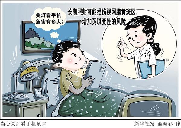 现代社会快节奏的生活模式下,电子设备使用时长激增,不良用眼习惯普遍,近视、眼疲劳等问题威胁各年龄段人群的眼部健康。每年的6月6日是全国爱眼日,针对公众关注较高的几类问题,记者采访了首都医科大学附属北京同仁医院斜视与小儿眼科主任医师付晶。关灯后看手机对眼睛伤害有多大?付晶说,黑暗环境中瞳孔扩大,让更多光线进入眼球,而手机屏幕产生的短波有害蓝光可穿透晶状体,长期照射可能损伤视网膜黄斑区,增加黄斑变性的风险。 新华社发 商海春 作