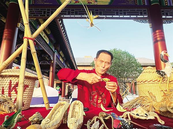 6月12日,在关帝庙文化广场非遗宣传展演展示现场,欧家棕编第八代传承人欧玉柱指尖翻飞,一片普通的棕叶在撕、拉、绕、穿之间,短短几分钟便化作一只活灵活现的蚂蚱——在围观人群的惊叹声里,这门诞生于清朝嘉庆年间的棕编技艺,穿越200余年时光,依然散发着旺盛的生命力。