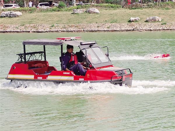 当日,在商水县阳城公园活动现场,水陆两栖救援车格外引人注目。它既能在陆地上快速行驶,也能在水中自如航行,可迅速抵达救援现场,转移受困群众,大大提升救援效率。
