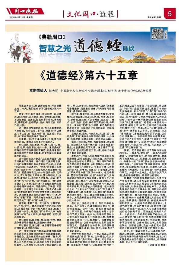 传承优秀文化,解读历史经典,开启智慧之光。今天,我们继续学习《道德经》第六十五章。