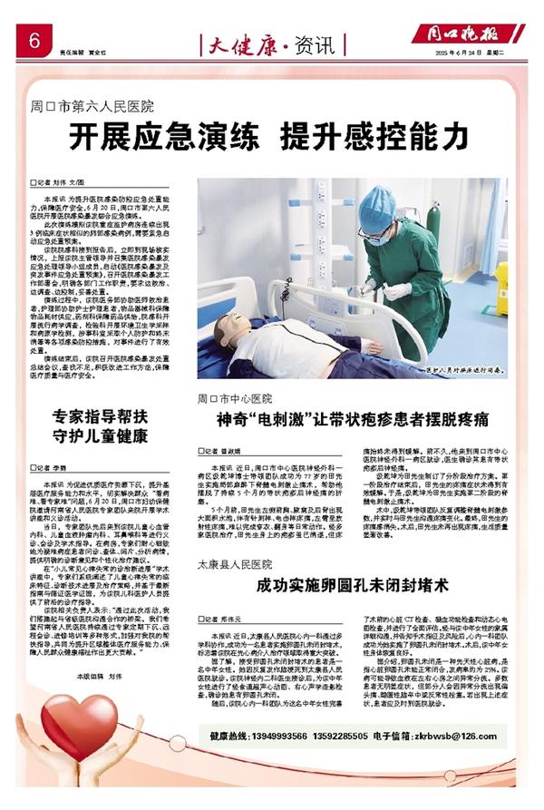 本报讯 近日,周口市中心医院神经外科一病区汲乾坤博士带领团队成功为77岁的田先生实施局部麻醉下脊髓电刺激止痛术,帮助他摆脱了持续5个月的带状疱疹后神经痛的折磨。