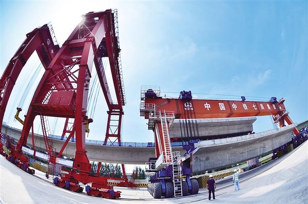 平漯周高铁周口段架设箱梁使用“桥上喂梁”模式:先用提梁机将箱梁装载至桥上运梁车,然后再运输至架桥机。