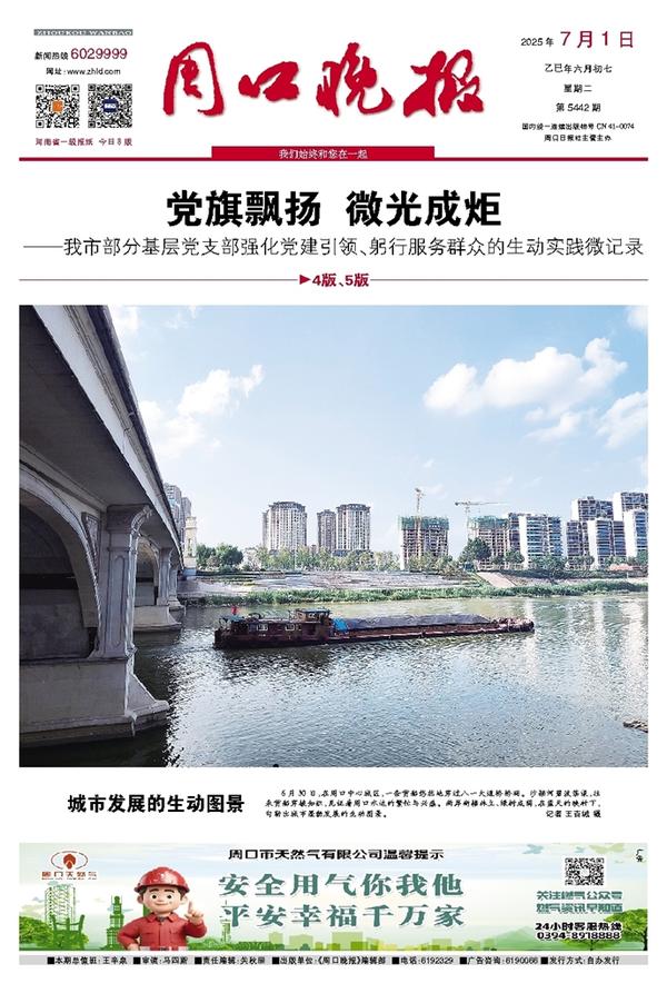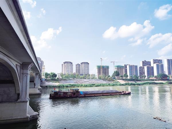 6月30日,在周口中心城区,一条货船悠然地穿过八一大道桥桥洞。沙颍河碧波荡漾,往来货船穿梭如织,见证着周口水运的繁忙与兴盛。两岸新楼林立、绿树成荫,在蓝天的映衬下,勾勒出城市蓬勃发展的生动图景。记者 王吉城 摄