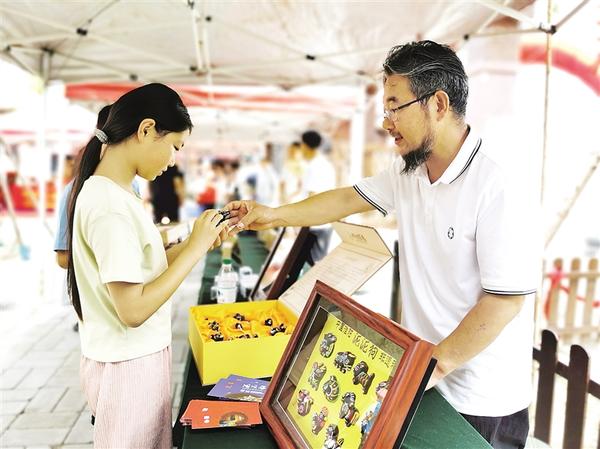 7月1日,非遗传承人向游客介绍泥泥狗。当日上午,我市30多位国家、省、市级非遗项目代表性传承人带着他们的作品(产品)在周口市江鸿生态农业园集中亮相,庆祝中国共产党成立104周年。借此机会,不少游客得以近距离领略周口非遗的独特魅力,真切感受非遗为乡村发展注入的蓬勃生机。记者 杜欣 摄