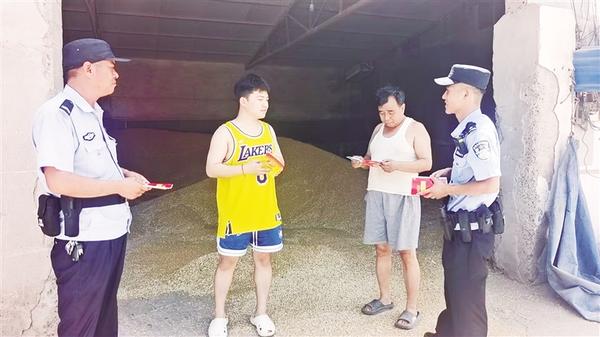 民警向群众普及反诈知识。为提升辖区涉农企业及群众的防诈骗意识,7月4日,商水县公安局张庄派出所民辅警深入辖区粮食收购站、面粉厂等涉农企业,开展预防电信诈骗及接触性诈骗宣传教育活动。通讯员 林漪婷 摄
