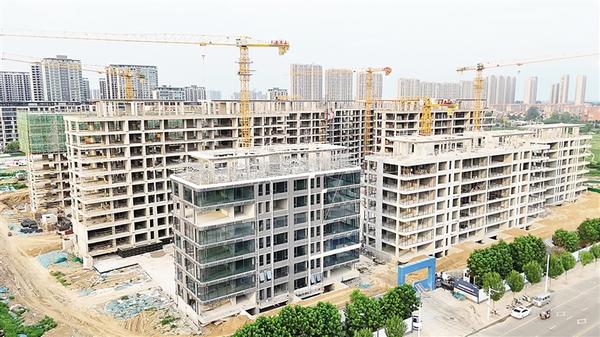 7月9日傍晚,太阳西沉,气温稍降,位于周口市滨河北路与腾飞路交会处东南角的水岸尚品项目施工现场一片忙碌:塔吊林立,近300名工人在不同岗位各司其职。靠南侧的8栋楼主体工程已经完成,楼体外立面施工和室内装饰工程正在展开,地下车库顶板防水工程同步进行;靠北侧的10栋楼主体工程施工正酣。