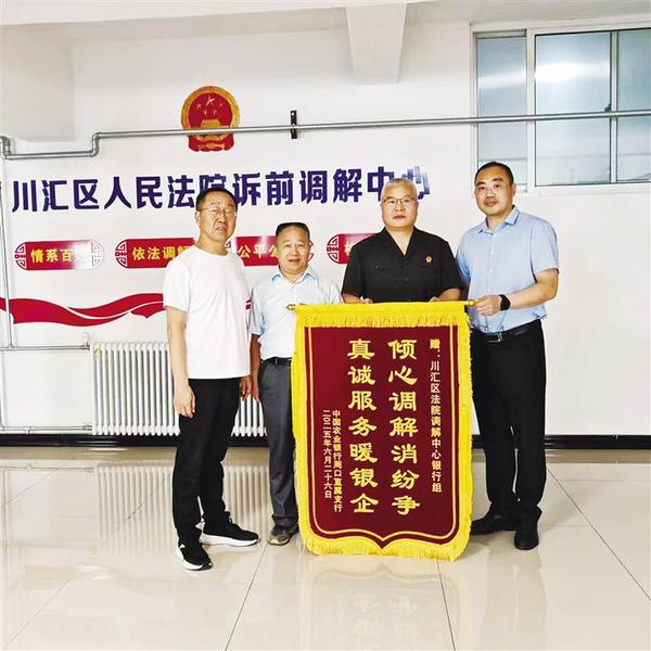 本报讯 近日,中国农业银行周口直属支行工作人员将一面绣有“倾心调解化纷争 真诚服务暖银企”字样的锦旗送至川汇区人民法院立案庭,向周口市银行保险业纠纷调解中心驻川汇区人民法院调解员李风山致以诚挚谢意。原来今年以来,川汇区人民法院与诉前调解中心共同努力,成功化解涉中国农业银行周口直属支行金融纠纷20余起,调解金额超300万元,为银企和谐发展注入司法动能。