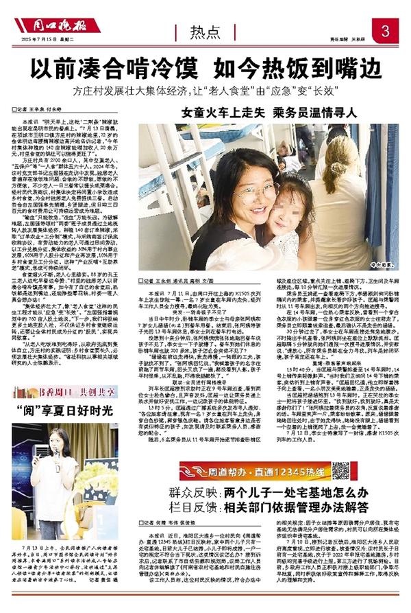 本报讯 7月11日,由周口开往上海的K1505次列车上发生惊险一幕:一名7岁女童在车厢内走失,经列车工作人员全力搜寻,最终化险为夷。