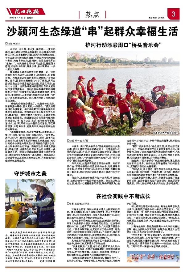 “看到‘桥头音乐会’这么受欢迎,我们也想为家乡出份力。干净的环境不仅让大家欣赏音乐会时心情更愉悦,也能让外地游客领略到周口的独特魅力。”参与活动的高考生康宇昊表示,正是这份对家乡的热爱,让志愿者不惧酷暑,用行动诠释责任。