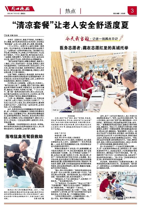 不仅要让老人住得舒服,还要让老人吃得安心。“我们在饮食上做了一些调整,增加了茄汁鸡块、糖醋鱼块等开胃爽口的荤菜,并搭配冬瓜、丝瓜等时令蔬菜,确保老人吃得好、吃得香、吃不腻。”7月16日中午,腾飞路一家养老机构的负责人李女士告诉记者,他们每天会根据老人的身体状况,分发西瓜、桃子等水果,并准备了绿豆汤、酸梅汤等解暑饮品。