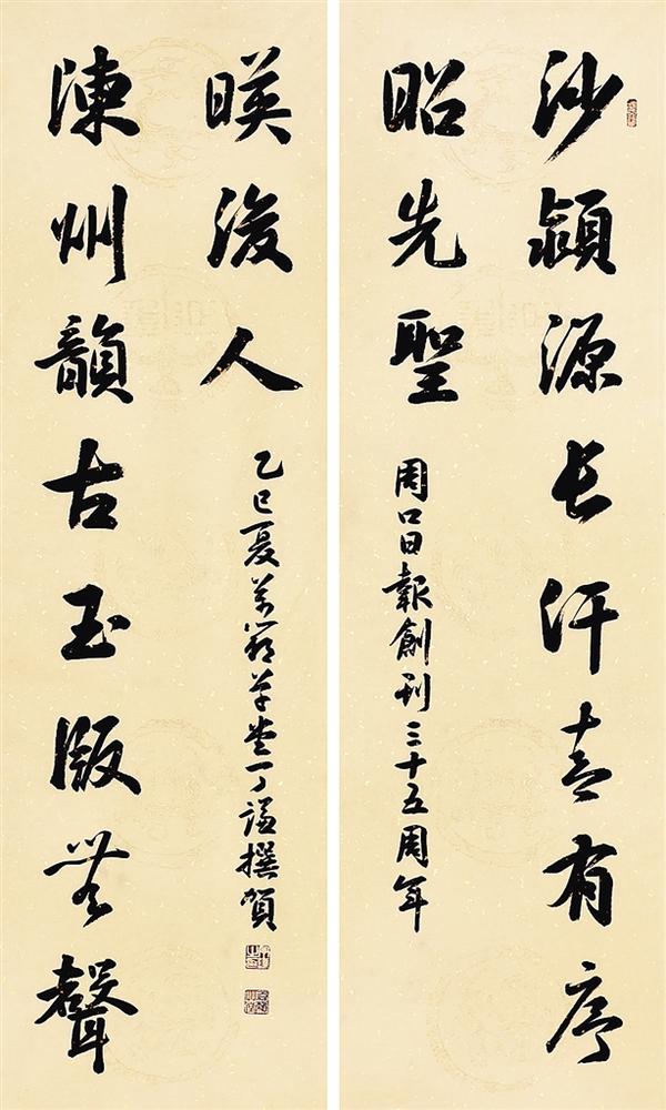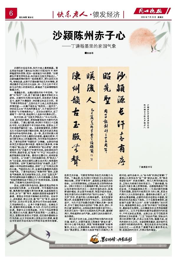 沙颍河水汤汤东流,陈州大地上墨香氤氲。著名军旅书法家丁谦先生为《周口日报》创刊35周年挥毫题写的贺联,犹如一曲穿越古今的赞歌:“沙颍源长汗青有序昭先圣,陈州韵古玉版无声映后人。”这副饱蘸深情的联作一经网络展示,便引动四方共鸣。细细品读,此联不仅凝结着书法艺术的精魄,更涌动着赤子还乡的文化血脉,将一方水土的千年文脉与当代报人的使命担当,都融进了这淋漓酣畅的翰墨之间。