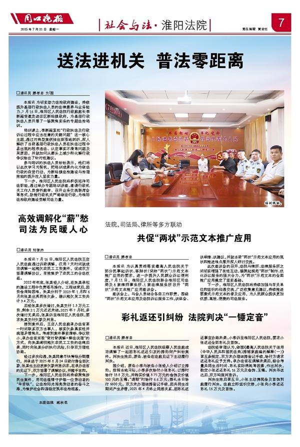本报讯 近日,淮阳区人民法院临蔡人民法庭成功调解了一起因彩礼返还引发的婚约财产纠纷案件。判决生效后,原告、被告在法庭见证下主动履行判决。