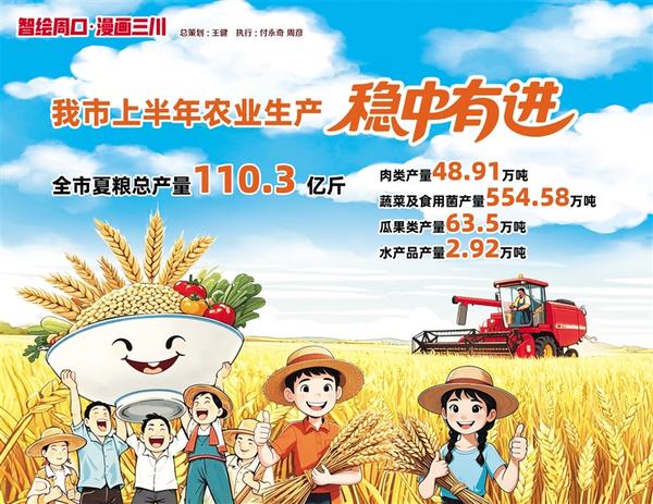 2025年上半年,我市农业生产稳中有进。全市夏粮总产量110.3 亿斤,同比增长0.01%,980.1万亩秋粮长势良好,丰收丰产基础扎实;肉类产量48.91万吨,同比增长3.19%;蔬菜及食用菌产量554.58万吨,同比增长3.28%;瓜果类产量63.5万吨,同比增长3.73%; 水产品产量2.92万吨,同比增长4.2%。记者 付永奇 周彦 文/图
