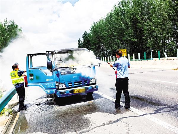 7月22日,周口市公安局高速交通警察支队一大队民警在出差返程途中,发现一辆行驶中的货车突发自燃。危急时刻,民警立即停车展开灭火救援,成功处置险情。