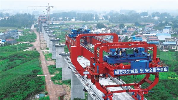 8月10日上午,中铁七局工人正在贾鲁河畔的平漯周高铁吊装设备上作业。据了解,截至目前,由中铁七局承建的周口境内平漯周高铁已经架设箱梁近8公里,从东向西“逼近”贾鲁河。记者 梁照曾 摄