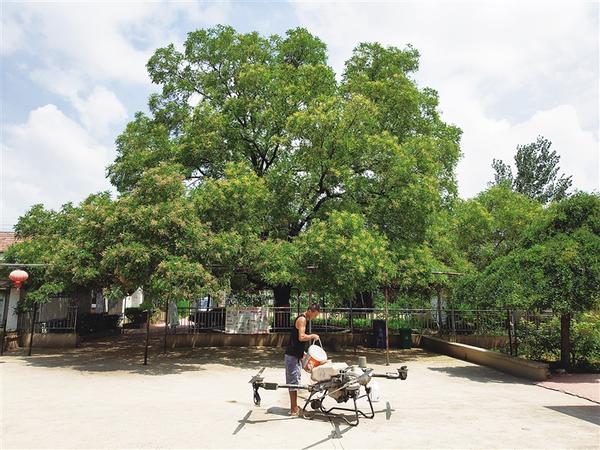 专业技术人员为植保无人机添加农药。郸城县宁平镇拥有多株百年以上树龄的古树,这些“绿色活化石”承载着当地的历史记忆。近日,该县自然资源局精心制定科学防治方案,组织专业技术团队赴宁平镇开展古树病虫害防治作业,为当地古树名木健康生长保驾护航。记者 徐松 通讯员 陈吴陆 王楠 巴敬敏 摄