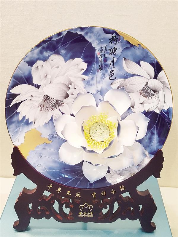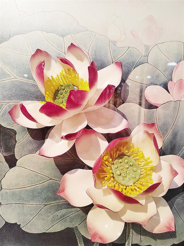 荷花瓷首展广州时,岭南知名学者、周口籍美术史论家李琰评价,二维世界的工笔画与立体的雕塑如何共舞而不相悖?这是荷花瓷审美形式的重要一环。皮伟深谙艺理同根,将工笔线条的韵律之美转化为支撑立体花叶的内在筋骨,将工笔画渲染的雅韵表现在立体花朵之上,以塑化形,以画入塑,让立体的荷花仿佛从平面的莲叶水墨背景中自然生长而出,打破了维度之墙,在空间里织就一曲虚实相生的莲之交响。