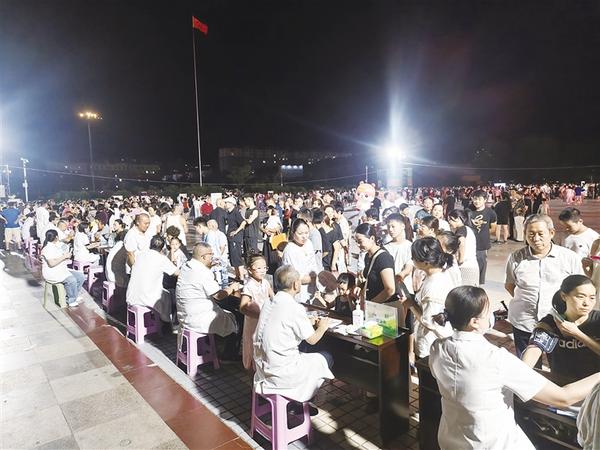 活动现场,太康县人民医院心血管内科、神经内科、呼吸内科等14个科室医务人员“坐镇”,为群众提供高质量义诊服务。千余名群众趁着晚上消暑纳凉,前来咨询健康问题,获取诊疗建议。
