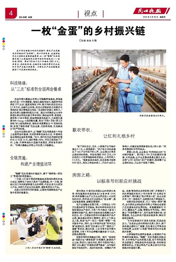 在乡村全面振兴的时代浪潮中,特色产业是激活农村经济的“金钥匙”。周口市西华县,这座传统农业大县依托畜禽养殖资源,让一枚“雏鹏”无抗鸡蛋实现了从养殖场到全国市场的华丽蜕变——溢价超300%,带动500余户农户年增收2000万元。其背后,是科技创新、全链升级与联农带农交织成的乡村产业振兴新图景,为特色农产品延链增效提供了可复制的鲜活样本。