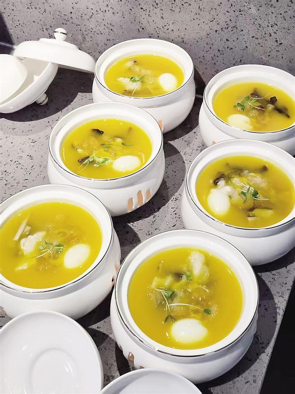 金玉满堂养荣盅这道药膳,将美味滋养与美好寓意完美融合,是一道滋养身心的珍宝之膳。汤品以金色、白色为主调——黄芪与金瓜的金色对应五行之“土”,主养脾胃,中医认为脾胃是“气血生化之源”,脾胃强健则身体根基稳固;麦冬、玉竹、松茸的白色对应五行之“金”,主养肺阴,肺主气司呼吸,肺阴充足则呼吸顺畅、皮肤润泽;松茸、金耳、牛肝菌等生长于深山的珍馐,富含天然营养;鸡肉、猪瘦肉、干贝、鸽子蛋等“血肉有情之品”,中医认为,这类食材能直接补充人体精血,滋养五脏六腑。金玉满堂本是形容财富充盈,而名为金玉满堂养荣盅的这道药膳赋予其新内涵:当人们五脏调和、气血充盈、精气神足,拥有一个健康的身体,才是人生最珍贵的“金玉满堂”。