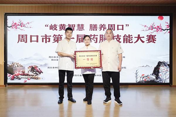 8月28日,周口市成功举办第一届药膳技能大赛。周口市中医院选派的3位选手,凭借对药食同源理念的精妙诠释,制作出安养五脏助眠煲、阴阳五行焗乳鸽、金玉满堂养荣盅三道药膳,最终斩获大赛团体一等奖。