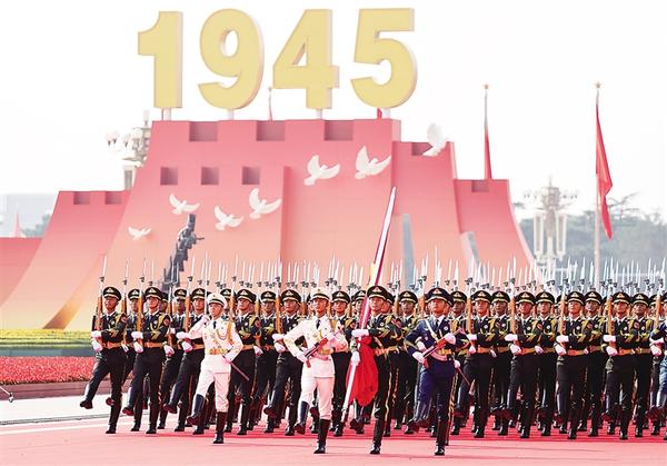 战旗猎猎,铁流滚滚。80面抗战英模部队荣誉旗帜组成的战旗方队,承载着历史荣光浩荡而来。这些英雄的旗帜、胜利的旗帜、不朽的旗帜,激励着人民军队勇往直前。装备方队编组陆上作战群、海上作战群、防空反导群、信息作战群、无人作战群、后装保障群、战略打击群隆隆驶来,接受检阅。新型坦克、无人智能、网电作战、高超声速、防空反导、战略导弹……从抗战时期土枪土炮到今天新型作战力量,国产现役主战装备和战略重器在天安门城楼前一一通过,展示坚决捍卫国家主权安全发展利益、坚定维护世界和平的钢铁意志和强大实力。